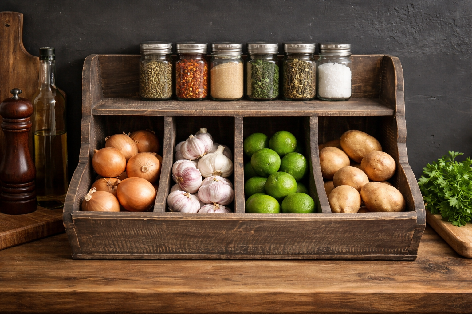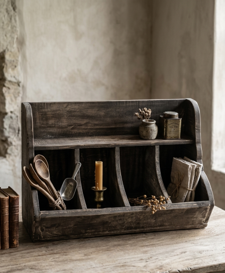 De gruttersbak beschikt over drie ruime vakken, ideaal om kruidenpotjes, knoflook, uien, keukenaccessoires of kleine voorraadproducten overzichtelijk op te bergen. Dankzij de compacte maar praktische afmetingen is hij perfect voor op het aanrecht, een keukentafel of een dressoir.