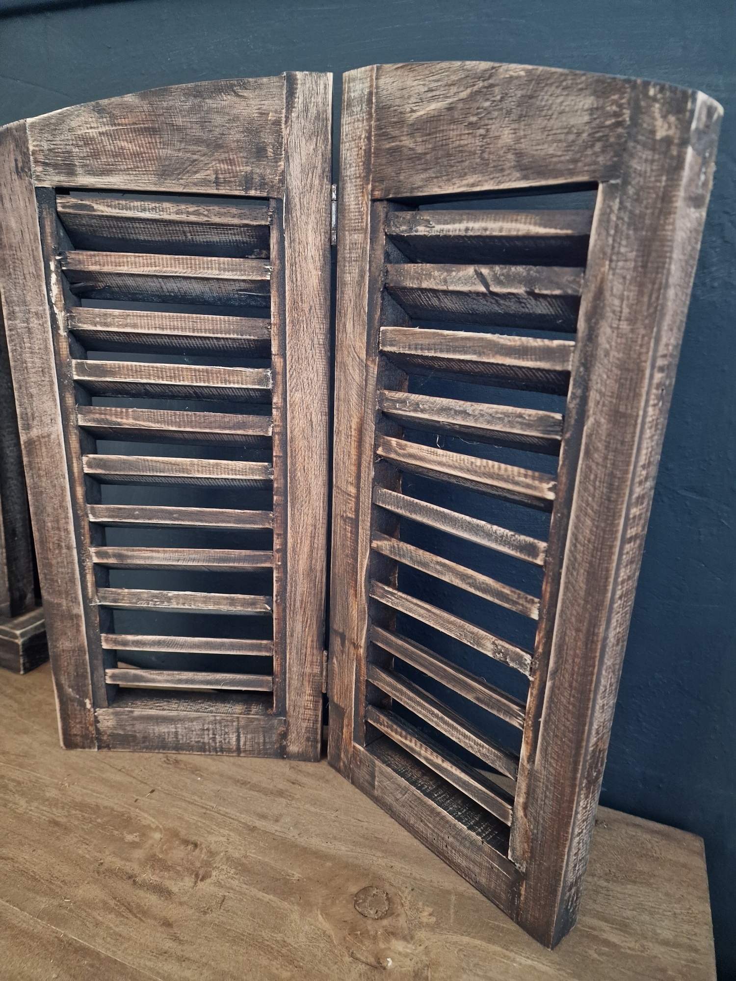 Dit dubbel gebogen louvreluik is een echte sfeermaker voor een stoer en warm interieur. Het luik is gemaakt van hout en heeft een robuuste, doorleefde uitstraling met subtiele vergrijsde tinten. Dankzij de scharnieren kun je het luik speels neerzetten of licht openklappen, wat zorgt voor extra diepte en karakter in je styling.