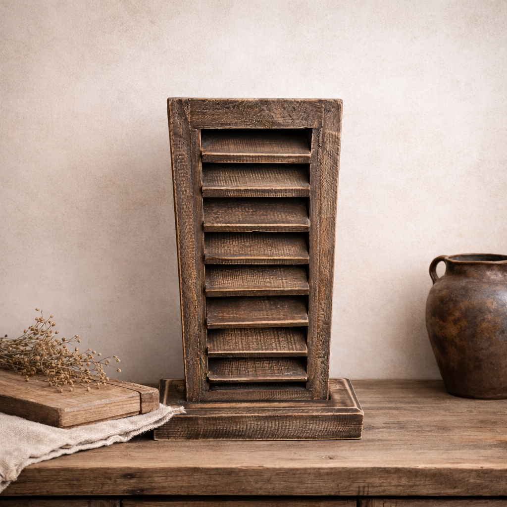 Dit landelijke louvreluik is een echte sfeermaker voor een stoer en warm interieur. Het luik is gemaakt van hout en heeft een robuuste, doorleefde uitstraling met subtiele vergrijsde tinten.
